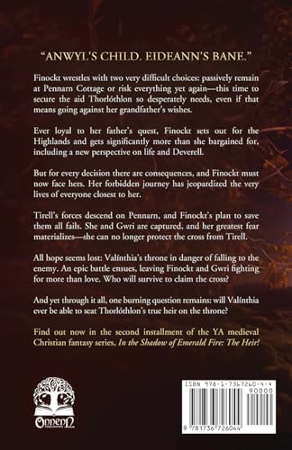 “Anwyl’s child. Eideann’s bane.” Finockt wrestles with two very difficult choices: passively remain at Pennarn Cottage or risk everything yet again to secure the aid Thorlothlon so desperately needs, even if that means going against her grandfather’s wishes. Ever loyal to her father’s quest, Finockt sets out for the Highlands and gets significantly more than she bargained for, including a new perspective on life and Deverell. But for every decision there are consequences, and Finockt must now face hers. Her forbidden journey has jeopardized the very lives of everyone closest to her. Tirell’s forces descend on Pennarn, and Finockt’s plan to save them all fails. She and Gwri are captured, and her greatest fear materializes–she can no longer protect the cross from Tirell. All hope seems lost: Valinthia’s throne in danger of falling to the enemy. An epic battle ensues, leaving Finockt and Gwri fighting for more than love. Who will survive to claim the cross? And yet through it all, one burning question remains: will Valinthia ever be able to seat Thorlothlon’s true heir on the throne? Find out now in the second installment of the YA medieval Christian fantasy series, In the Shadow of Emerald Fire: The Heir!