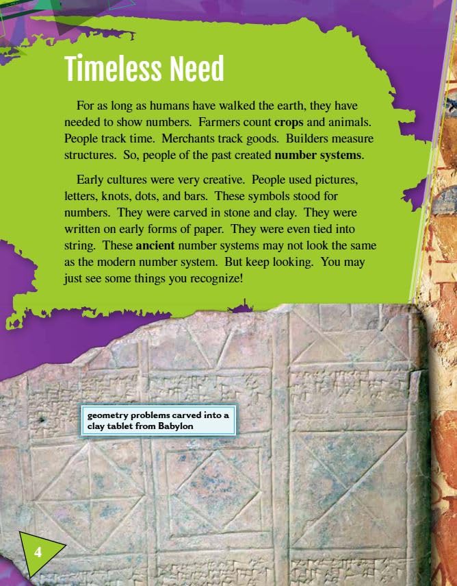 Learn the history of number systems with this engaging book! This text combines mathematics and literacy skills, and uses practical, real-world examples of problem solving to teach math and language arts content. Students will learn place value while reading about the number systems of the Egyptians and Romans, and also learn important vocabulary terms like cuneiform, binary systems, roman numerals, and more! The full-color images, math charts, and practice problems make learning math easy and fun. The table of contents, glossary, and index will further understanding of math and reading concepts. The Math Talk problems and Explore Math sidebars provide additional learning opportunities while developing students’ higher-order thinking skills.