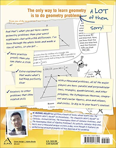 Are you a befuddled math student who’s struggling with geometry? The Humongous Book of Geometry Problems is like no other geometry workbook on the market and is the answer for anyone who doesn’t speak math. Bestselling author W. Michael Kelley helps make otherwise baffling solutions perfectly clear by taking a typical geometry workbook, filling it with solved problems, and making notes in the margins to add missing steps and simplify concepts. By learning how to interpret and solve problems as they are presented in courses, students will become fully prepared to solve even the most obscure geometry problem. No more solving by trial and error! Here’s what you’ll find in this this fun and simple guide: * 1000 geometry problems and solutions, each solved to completion * Annotations and helpful notes for each problem to help clarify the solutions and fill in the missing steps needed to reach the solutions * Coverage of all the critical geometry concepts, with each explained in detail and in simple, straightforward language that any student can grasp and apply
