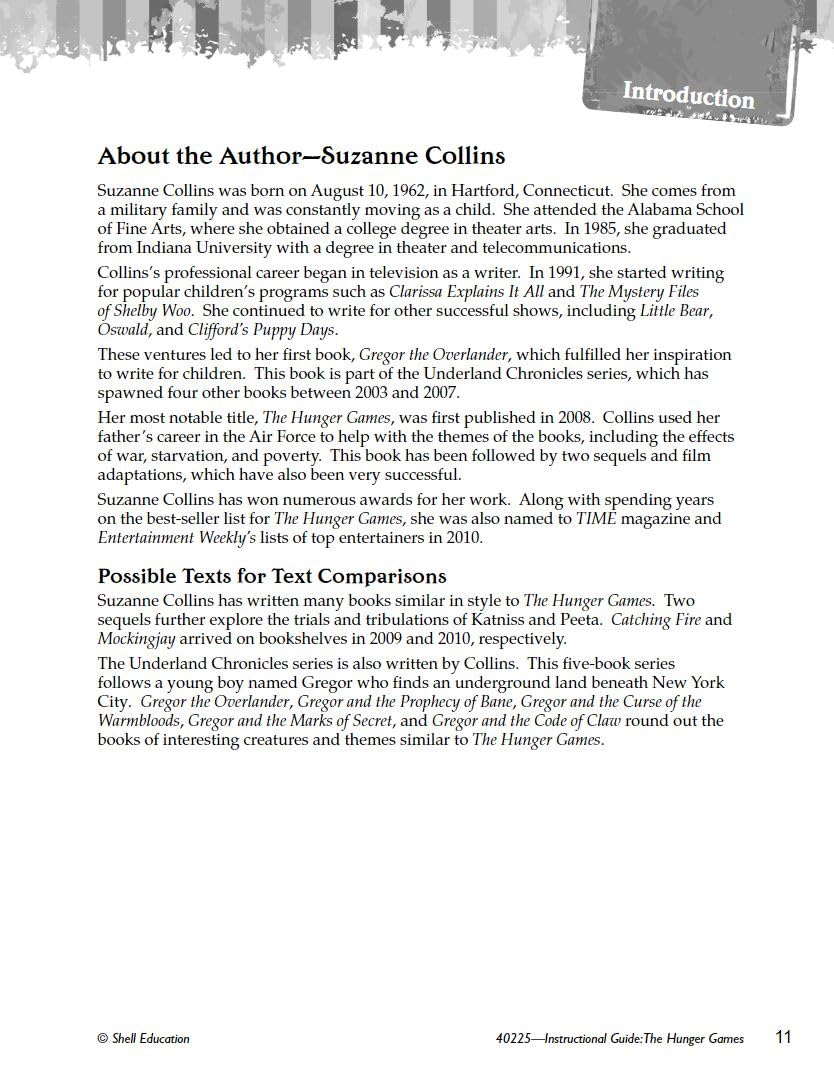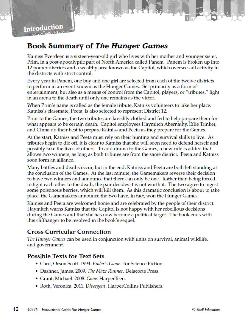 The Hunger Games: An Instructional Guide for Literature provides lesson plans and activities for this popular Young Adult fiction novel. This valuable resource guides teachers with ways to add rigor with complex literature. Text-dependent questions help students analyze the text with higher-order thinking skills, with lessons focused on story elements, vocabulary, and more. Close reading activities throughout the literature units encourages students to use textual evidence as they revisit passages to respond more critically. With various methods of assessing comprehension, this instructional guide offers strategies for cross-curricular activities as students build a greater understanding of this great literary work.