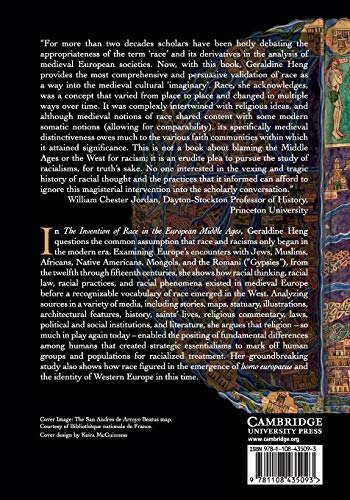 In The Invention of Race in the European Middle Ages, Geraldine Heng questions the common assumption that the concepts of race and racisms only began in the modern era. Examining Europe’s encounters with Jews, Muslims, Africans, Native Americans, Mongols, and the Romani (‘Gypsies’), from the 12th through 15th centuries, she shows how racial thinking, racial law, racial practices, and racial phenomena existed in medieval Europe before a recognizable vocabulary of race emerged in the West. Analysing sources in a variety of media, including stories, maps, statuary, illustrations, architectural features, history, saints’ lives, religious commentary, laws, political and social institutions, and literature, she argues that religion – so much in play again today – enabled the positing of fundamental differences among humans that created strategic essentialisms to mark off human groups and populations for racialized treatment. Her ground-breaking study also shows how race figured in the emergence of homo europaeus and the identity of Western Europe in this time.