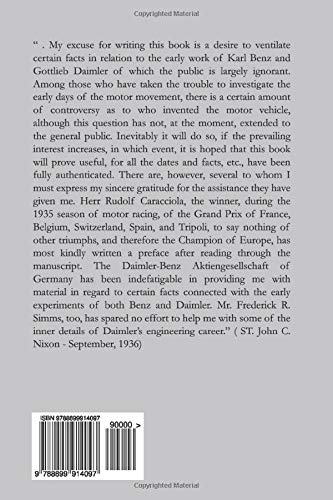 ” . My excuse for writing this book is a desire to ventilate certain facts in relation to the early work of Karl Benz and Gottlieb Daimler of which the public is largely ignorant. Among those who have taken the trouble to investigate the early days of the motor movement, there is a certain amount of controversy as to who invented the motor vehicle, although this question has not, at the moment, extended to the general public. Inevitably it will do so, if the prevailing interest increases, in which event, it is hoped that this book will prove useful, for all the dates and facts, etc., have been fully authenticated. There are, however, several to whom I must express my sincere gratitude for the assistance they have given me. Herr Rudolf Caracciola, the winner, during the 1935 season of motor racing, of the Grand Prix of France, Belgium, Switzerland, Spain, and Tripoli, to say nothing of other triumphs, and therefore the Champion of Europe, has most kindly written a preface after reading through the manuscript. The Daimler-Benz Aktiengesellschaft of Germany has been indefatigable in providing me with material in regard to certain facts connected with the early experiments of both Benz and Daimler. Mr. Frederick R. Simms, too, has spared no effort to help me with some of the inner details of Daimler’s engineering career.” ( ST. John C. Nixon – September, 1936)