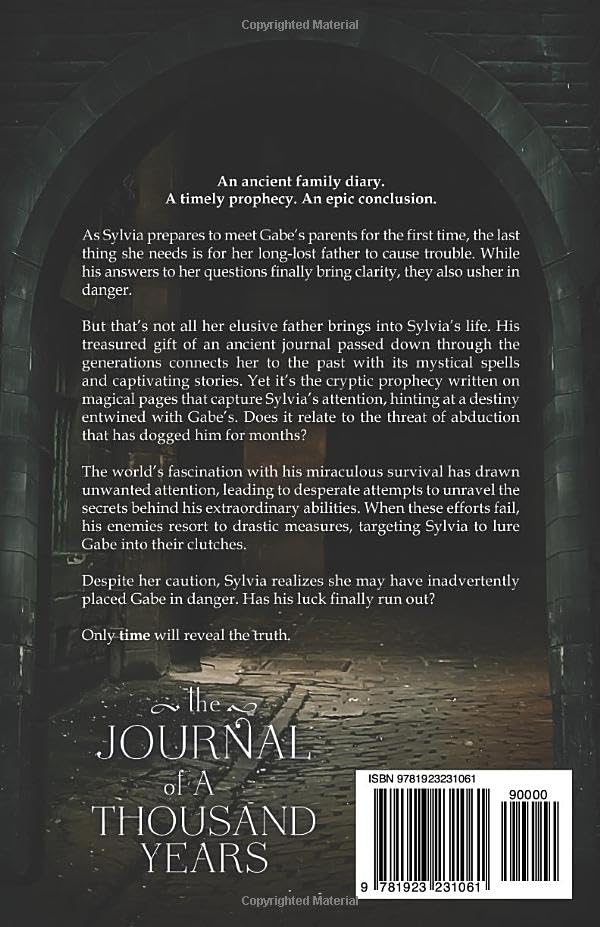 An ancient family diary. A timely prophecy. An epic conclusion. As Sylvia prepares to meet Gabe’s parents for the first time, the last thing she needs is for her long-lost father to cause trouble. While his answers to her questions finally bring clarity, they also usher in danger. But that’s not all her elusive father brings into Sylvia’s life. His treasured gift of an ancient journal passed down through the generations, connects her to the past with its mystical spells and captivating stories. Yet it’s the cryptic prophecy written on magical pages that capture Sylvia’s attention, hinting at a destiny entwined with Gabe’s. Does it relate to the threat of abduction that has dogged him for months? The world’s fascination with his miraculous survival has drawn unwanted attention, leading to desperate attempts to unravel the secrets behind his extraordinary abilities. When these efforts fail, his enemies resort to drastic measures, targeting Sylvia to lure Gabe into their clutches. Despite her caution, Sylvia realizes she may have inadvertently placed Gabe in danger. Has his luck finally run out? Only time will reveal the truth.