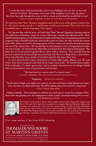The Junction Boy is now a television movie produced by ESPN, starring Tom Berenger as Bryant. The legendary Paul “Bear” Bryant is recognized nationwide as one of the greatest coaches ever. So why did he always cite his 1-9 A&M team of 1954 as his favorite? This is the story of a remarkable team – and the beginning of the legend. The Junction Boys tells the story of Coach Paul “Bear” Bryant’s legendary training camp in the small town of Junction, Texas. In a move that many consider the salvation of the Texas A&M football program, Coach Bryant put 115 players through the most grueling practices ever imagined. Only a handful of players survived the entire 10 days, but they braved the intense heat of the Texas sun and the burning passion of their coach, and turned a floundering team into one of the nation’s best. The Junction Boys is more than just a story of tough practices without water breaks. An extraordinary fellowship was forged from the mind-numbing pain. The thirty-five survivors bonded together like no other team in America. They profited from the Junction experience; the knowledge they took back with them to College Station, about themselves and what they were capable of, would be used for the rest of their lives. In vivid and powerful images reminiscent of Friday Night Lights, Hoosiers, and The Last Picture Show, these young men and their driven coach come to life. The Junction Boys contains all the hallmarks of a classic sports story, and it combines America’s love of college football with an extraordinary story of perseverance and triumph.