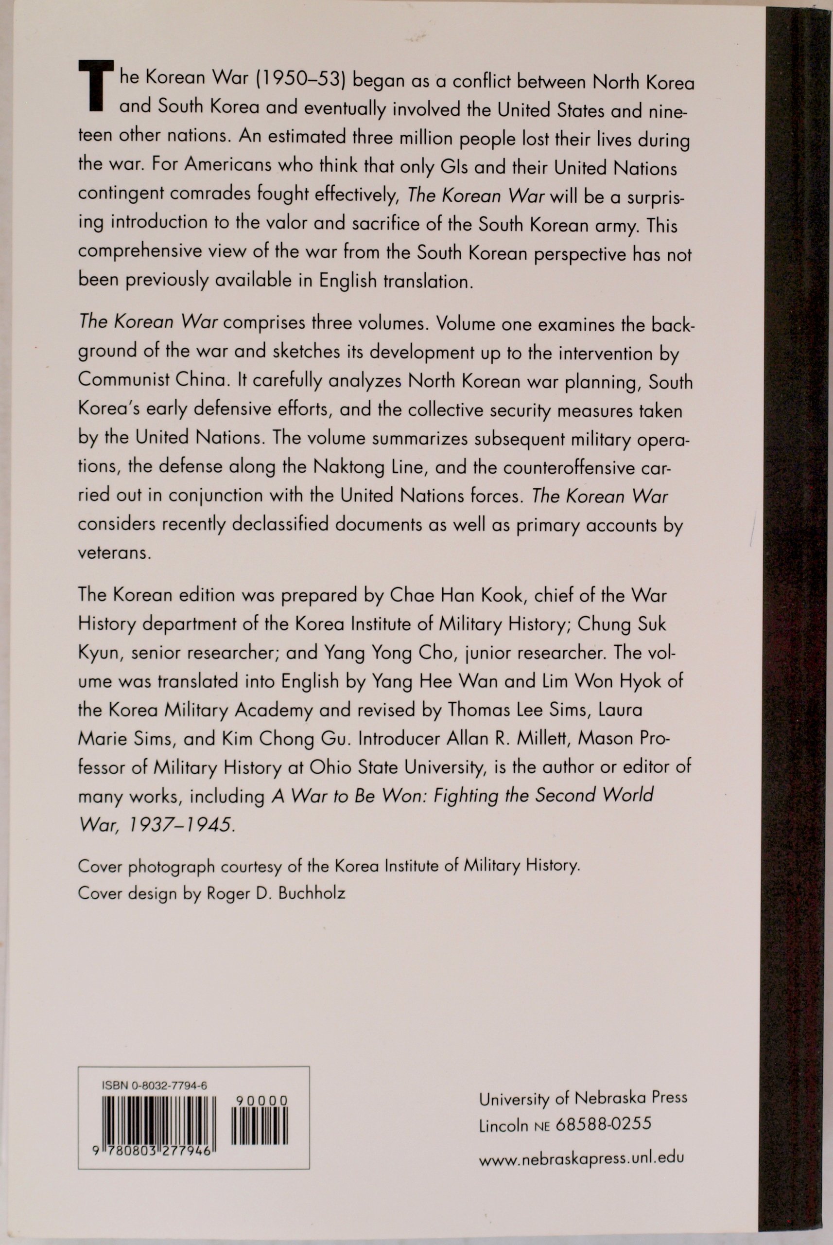 The Korean War (195053) began as a conflict between North Korea and South Korea and eventually involved the United States and nineteen other nations. An estimated three million people lost their lives during the war. For Americans who think that only GIs and their United Nations contingent comrades fought effectively, The Korean War will be a surprising introduction to the valor and sacrifice of the South Korean army. This comprehensive view of the war from the South Korean perspective has not been previously available in English translation. The Korean War comprises three volumes. Volume one examines the background of the war and sketches its development up to the intervention by Communist China. It carefully analyzes North Korean war planning, South Korea’s early defensive efforts, and the collective security measures taken by the United Nations. The volume summarizes subsequent military operations, the defense along the Naktong Line, and the counteroffensive carried out in conjunction with the United Nations forces. The Korean War considers recently declassified documents as well as primary accounts by veterans.