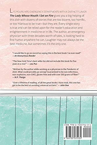The Lady Whose Mouth I Set on Fire . . . and Other True Tales from the ER is a collection of amazing, bizarre, but factual stories revealing the world of the ER. They are first-hand accounts told by an old, tired physician who has survived three decades in this odd, but exciting world of life and death. They are heartwarming, heart-wrenching, hilarious or fascinating. This book is for anyone interested in the inner belly of the Human Being. There is much to be learned and felt here. Beware, this book is not for everyone, and you may begin laughing at inappropriate times–or even develop nightmares.