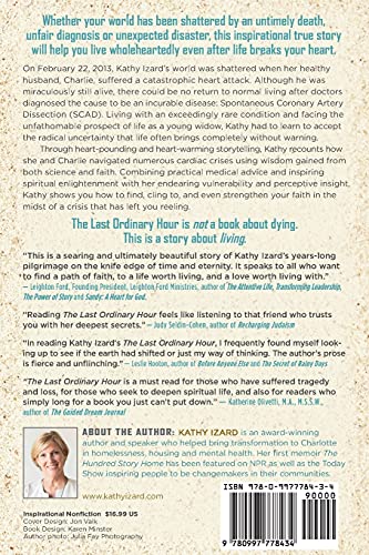 Whether your world has been shattered by an untimely death, unfair diagnosis or unexpected disaster, this inspirational true story will help you live wholeheartedly even after life breaks your heart. On February 22, 2013, Kathy Izard’s world was shattered when her healthy husband, Charlie, suffered a catastrophic heart attack. Although he was miraculously still alive, there could be no return to normal living after doctors diagnosed the cause to be an incurable disease: Spontaneous Coronary Artery Dissection (SCAD). Living with an exceedingly rare condition and facing the unfathomable prospect of life as a young widow, Kathy had to learn to accept the radical uncertainty that life often brings completely without warning. Through heart-pounding and heart-warming storytelling, Kathy recounts how she and Charlie navigated numerous cardiac crises using wisdom gained from both science and faith. Combining practical medical advice and inspiring spiritual enlightenment with her endearing vulnerability and perceptive insight, Kathy shows you how to find, cling to, and even strengthen your faith in the midst of a crisis that has left you reeling. The Last Ordinary Hour is not a book about dying. This is a story about living. “This is a searing and ultimately beautiful story of Kathy Izard’s years-long pilgrimage on the knife edge of time and eternity. It speaks to all who want to find a path of faith, to a life worth living, and a love worth living with.” Leighton Ford, Founding President, Leighton Ford Ministries, author of The Attentive Life, The Power of Story and many other titles “The Last Ordinary Hour is a must read for those who have suffered tragedy and loss, for those who seek to deepen spiritual life, and also for readers who simply long for a book you just can’t put down.” Katherine Olivetti, M., MSSW, Author, The Guided Dream Journal “In reading Kathy Izard’s The Last Ordinary Hour, I frequently found myself looking up to see if the earth had shifted or just my way of thinking. The author’s prose is fierce and unflinching.” Leslie Hooton, author of Before Anyone Else and The Secret of Rainy Days “This beautiful, compelling book is a powerful love story and an astute exploration of what it means to have faith when the future is entirely uncertain.” Kate H. Rademacher, author of Reclaiming Rest and Their Faces Shone. “Honest and open, Kathy Izard has penned a gift to anyone wondering how to journey on and fully love and embrace a life they never planned or imaged. . .The Last Ordinary Hour is a book I’ll read and reread. It’s a book I didn’t know I was waiting for.” Niki Hardy. Author of Breathe Again, host of the podcast Chemo Chair Prayers and Trusting God Through Cancer Summit “Reading The Last Ordinary Hour feels like listening to that friend who trusts you with her deepest secrets.” Judy Seldin-Cohen, author of Recharging Judaism “This deeply moving story describes Kathy’s journey through shock, recovery, and healing into thriving– It is an incredible read that I could not put down.” Brian Allain, Founder of Writing for your Life and Compassionate Christianity “This book will stop and start your heart several times. Not because it is scary but because it is sacred.” Reverend Lisa Saunders, author, Even at the Grave