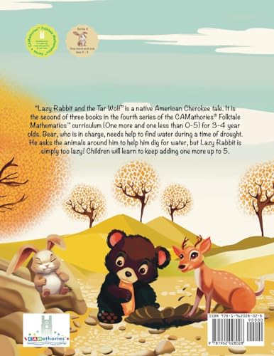 “Lazy Rabbit and the Tar Wolf” is a native American Cherokee tale. It is the second of three books in the fourth series of the CAMathoriesTM Folktale MathematicsTM curriculum (One more and one less, 0-5) for 3-4 year-olds. Bear, who is in charge, needs help to find water during a time of drought. He asks the animals around him to help him dig for water, but the Lazy Rabbit is simply too lazy! Children will learn to keep adding one more up to 5.