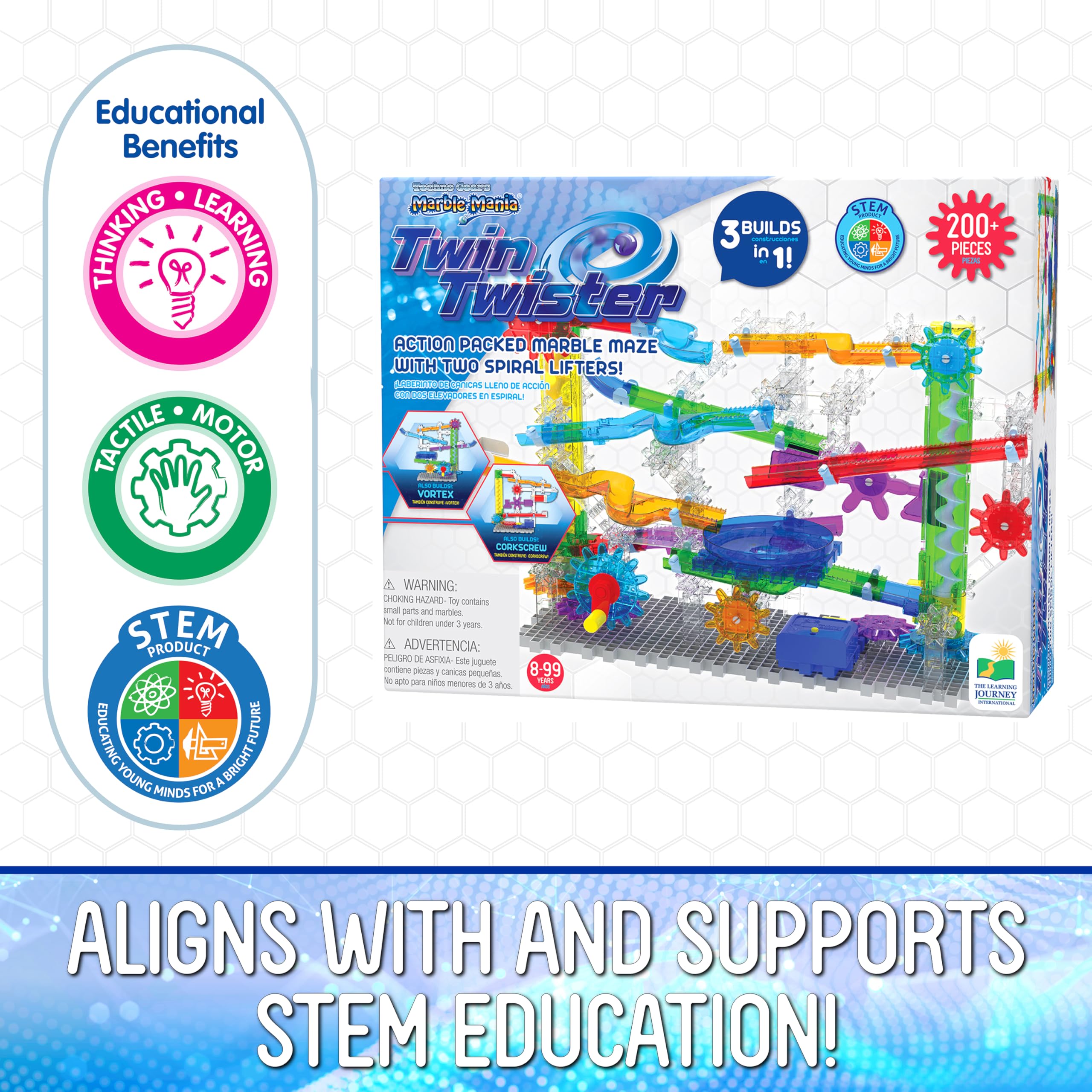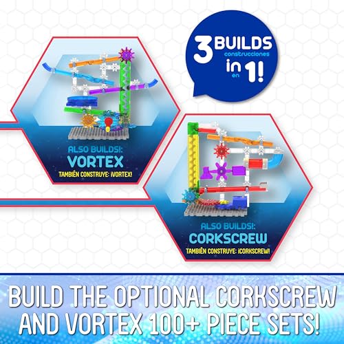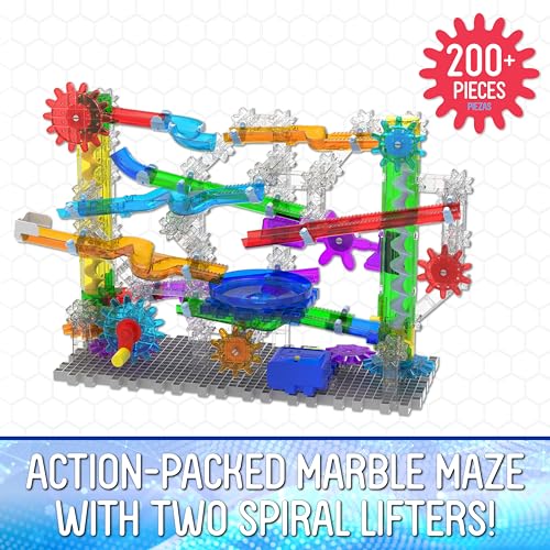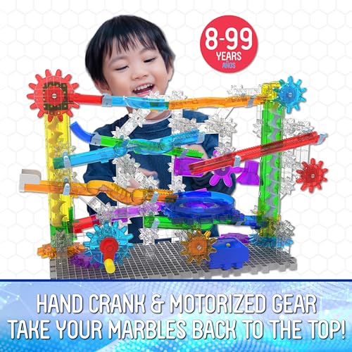 The 3 in 1 Techno Gears Marble Mania TwinTwister includes over 200 pieces and is an action-packed marble maze with multiple building options. Complete with colorful twists, turns and tracks, the set includes both a hand crank and a motorized gear lifter to take your marbles up to the top of the run for another exciting adventure. Enjoy even more fun by building the optional Corkscrew and Vortex 100+ piece sets as well! This is a great STEM educational product. Ages 8-14 years.
