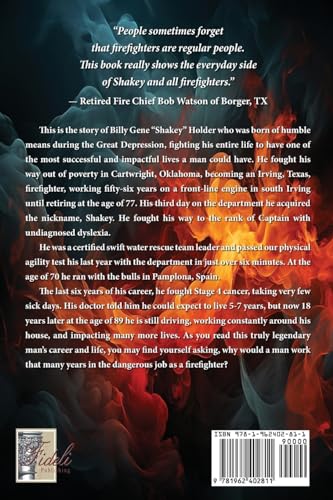“People sometimes forget that firefighters are regular people. This book really shows the everyday side of Shakey and all firefighters.” — Retired Fire Chief Bob Watson of Borger, TX This is the story of Billy Gene “Shakey” Holder who was born of humble means during the Great Depression, fighting his entire life to have one of the most successful and impactful lives a man could have. He fought his way out of poverty in Cartwright, Oklahoma, becoming an Irving, Texas, firefighter, working fifty-six years on a front-line engine in south Irving until retiring at the age of 77. His third day on the department he acquired the nickname, Shakey. He fought his way to the rank of Captain with undiagnosed dyslexia. He was a certified swift water rescue team leader and passed our physical agility test his last year with the department in just over six minutes. At the age of 70 he ran with the bulls in Pamplona, Spain. The last six years of his career, he fought Stage 4 cancer, taking very few sick days. His doctor told him he could expect to live 5-7 years, but now 18 years later at the age of 89 he is still driving, working constantly around his house, and impacting many more lives. As you read this truly legendary man’s career and life, you may find yourself asking, why would a man work that many years in the dangerous job as a firefighter?