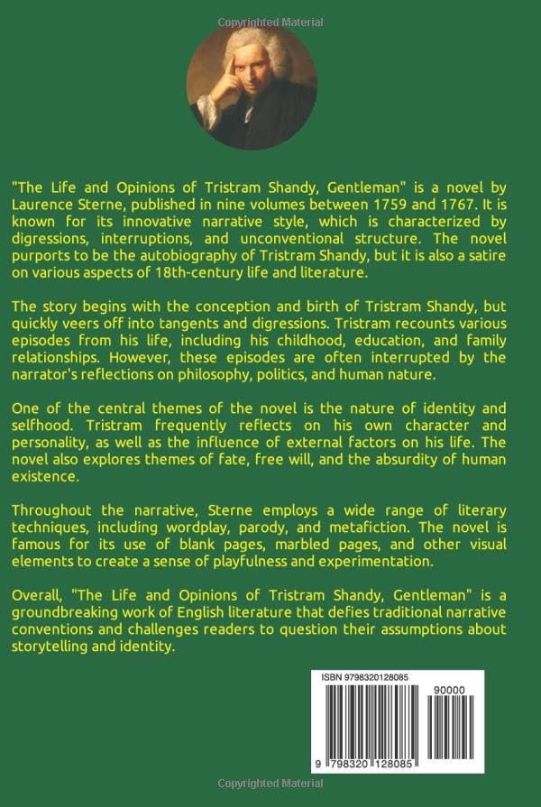 “The Life and Opinions of Tristram Shandy, Gentleman” is a novel by Laurence Sterne, published in nine volumes between 1759 and 1767. It is known for its innovative narrative style, which is characterized by digressions, interruptions, and unconventional structure. The novel purports to be the autobiography of Tristram Shandy, but it is also a satire on various aspects of 18th-century life and literature. The story begins with the conception and birth of Tristram Shandy, but quickly veers off into tangents and digressions. Tristram recounts various episodes from his life, including his childhood, education, and family relationships. However, these episodes are often interrupted by the narrator’s reflections on philosophy, politics, and human nature. One of the central themes of the novel is the nature of identity and selfhood. Tristram frequently reflects on his own character and personality, as well as the influence of external factors on his life. The novel also explores themes of fate, free will, and the absurdity of human existence. Throughout the narrative, Sterne employs a wide range of literary techniques, including wordplay, parody, and metafiction. The novel is famous for its use of blank pages, marbled pages, and other visual elements to create a sense of playfulness and experimentation. Overall, “The Life and Opinions of Tristram Shandy, Gentleman” is a groundbreaking work of English literature that defies traditional narrative conventions and challenges readers to question their assumptions about storytelling and identity.