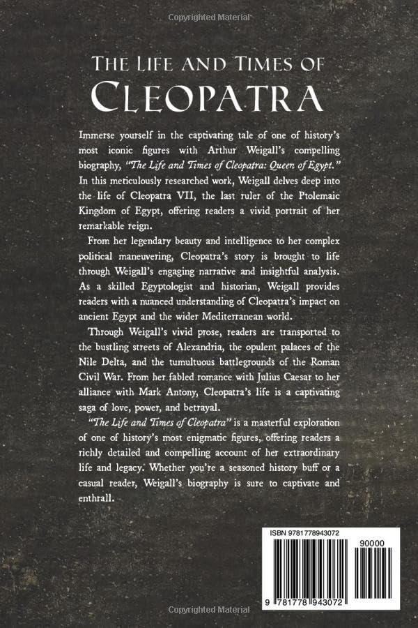 Immerse yourself in the captivating tale of one of history’s most iconic figures with Arthur Weigall’s compelling biography, “The Life and Times of Cleopatra: Queen of Egypt.” In this meticulously researched work, Weigall delves deep into the life of Cleopatra VII, the last ruler of the Ptolemaic Kingdom of Egypt, offering readers a vivid portrait of her remarkable reign. From her legendary beauty and intelligence to her complex political maneuvering, Cleopatra’s story is brought to life through Weigall’s engaging narrative and insightful analysis. As a skilled Egyptologist and historian, Weigall provides readers with a nuanced understanding of Cleopatra’s impact on ancient Egypt and the wider Mediterranean world. Through Weigall’s vivid prose, readers are transported to the bustling streets of Alexandria, the opulent palaces of the Nile Delta, and the tumultuous battlegrounds of the Roman Civil War. From her fabled romance with Julius Caesar to her alliance with Mark Antony, Cleopatra’s life is a captivating saga of love, power, and betrayal. “The Life and Times of Cleopatra” is a masterful exploration of one of history’s most enigmatic figures, offering readers a richly detailed and compelling account of her extraordinary life and legacy. Whether you’re a seasoned history buff or a casual reader, Weigall’s biography is sure to captivate and enthrall.