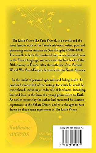 The Little Prince [Le Petit Prince], is a novella and the most famous work of the French aristocrat, writer, poet and pioneering aviator Antoine de Saint-Exupery (1900-1944). The novella is both the most-read and most-translated book in the French language, and was voted the best book of the 20th century in France. After the outbreak of the Second World War Saint-Exupery became exiled in North America. In the midst of personal upheavals and failing health, he produced almost half of the writings for which he would be remembered, including a tender tale of loneliness, friendship, love and loss, in the form of a young prince fallen to Earth. An earlier memoir by the author had recounted his aviation experiences in the Sahara Desert, and he is thought to have drawn on those same experiences in The Little Prince. Since its first publication in the United States, the novella has been adapted to numerous art forms and media, including audio recordings, radio plays, live stage, film screen, television, ballet, and operatic works.