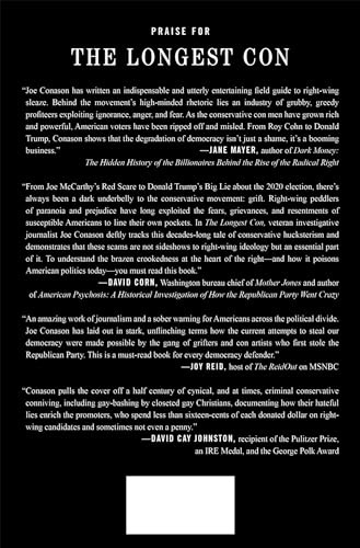 A sardonic chronicle of how conservatism turned into a racketeering enterprise – and why Donald Trump became the living emblem of the American right’s moral decay. The Longest Con tells the fascinating story of the partisan con artists who have corrupted conservative politics in our time, creating a toxic phenomenon that culminated in the election of Donald Trump, a bumptious fraud whose checkered career and tawdry retinue, including his presidential cabinet, have featured almost every variety of scam. But long before he appeared, Trump’s path to power was blazed by the motley horde of swindlers and quacks who preceded him. From the “professional anti-communists” (whose tactics even J. Edgar Hoover despised) to the “populist” grifters of the Tea Party movement and the religious charlatans of the “prosperity gospel” (who provided a pious front for Trump), the right-wing ripoff has remained remarkably consistent, even as personalities change and new technologies emerge: Stir up anger and resentment, demonize political opponents, promise vengeance, and collect donations from the gullible. It’s a highly lucrative game that any unscrupulous charlatan can play, as many have – and they are named in these pages. In an unsparing and often comic narrative, Joe Conason explores the right’s long, steep descent into a movement whose principal aim is not to protect freedom or defend the Constitution, but merely to line the pockets of pretenders and blowhards whose malevolent tactics now endanger the nation.