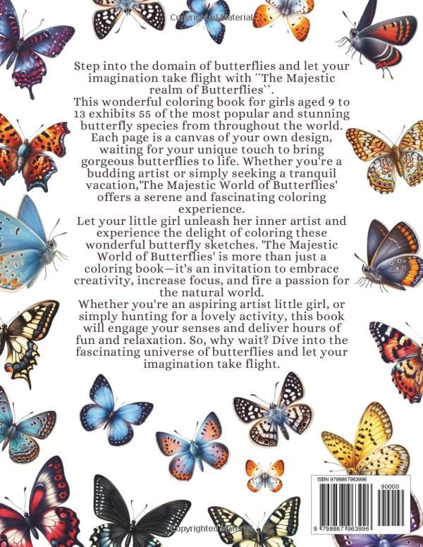 Embark on a Vibrant Adventure: Explore Earth’s Exquisite Butterflies and immerse yourself in the world of these beautiful creatures. 55 Different Beautiful Butterflies: Color and Bring to Life 55 stunning butterfly species from around the world, letting your creativity take flight. Discover the World’s Most Popular Butterflies: Get up close and personal with the stunning and sought-after butterfly species from across the globe. Unleash Your Inner Artist: Allow your creativity to soar as you experience the delight of coloring these magnificent butterflies. Increase Focus and Embrace Creativity: Each stroke of your coloring tool not only enhances focus but also fuels your artistic spirit. Tranquil and Serene Coloring Experience: Tailored for girls aged 8-13, this coloring book offers a peaceful and captivating creative journey. Hours of Fun, Relaxation, and Inspiration Awaits: Immerse yourself in the world of 55 beautiful butterflies, experiencing joy, relaxation, and inspiration. More Than Just a Coloring Book: “The Majestic World of Butterflies” invites you to embrace creativity and kindle a passion for nature, making it an enriching and delightful experience.Dive into the fascinating universe of butterflies with “The Majestic World of Butterflies.” This delightful coloring book is tailored for creative girls aged 8-13, offering a joyful and educational coloring journey. With 55 different beautiful butterfly species to color. Each page is a canvas waiting for your unique touch, allowing you to bring these beautiful creatures to life. Whether you’re a budding artist or simply seeking a tranquil escape, this coloring book offers a serene and fascinating experience. Let your creativity flourish and embrace the wonders of nature with “The Majestic World of Butterflies.”