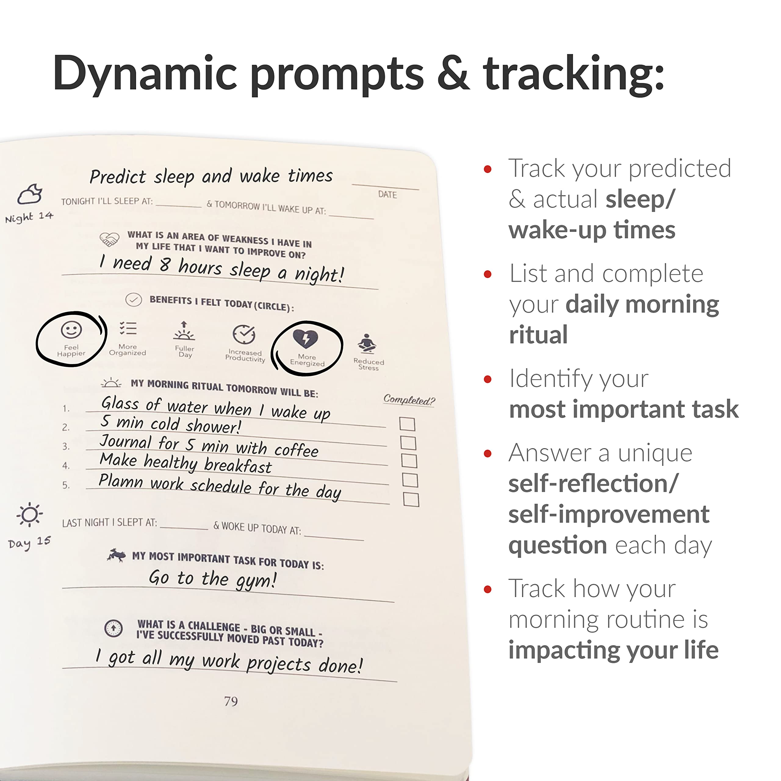 - DAILY JOURNAL WITH TRACKING PROMPTS: Each day, you get one piece of content, AND a dynamic tracking page to track your ideal sleep time, wake up time, and morning routine. ON TOP OF THAT, you’ll get bonus reflection questions to help you think about different aspects of your life and how you can use your mornings to improve your life in a wholesome way. UNLIKE OTHER JOURNALS, the tracking changes daily, with new prompts and reflection questions so you don’t become desensitized!