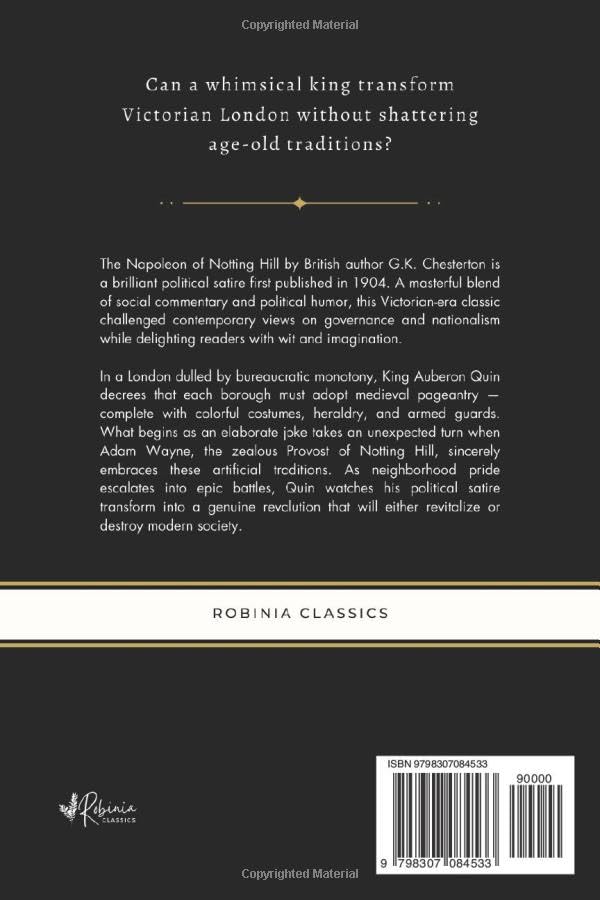 Can a whimsical king transform Victorian London without shattering age-old traditions? The Napoleon of Notting Hill by British author G.K. Chesterton is a brilliant political satire first published in 1904. A masterful blend of social commentary and political humor, this Victorian-era classic challenged contemporary views on governance and nationalism while delighting readers with wit and imagination. In a London dulled by bureaucratic monotony, King Auberon Quin decrees that each borough must adopt medieval pageantry — complete with colorful costumes, heraldry, and armed guards. What begins as an elaborate joke takes an unexpected turn when Adam Wayne, the zealous Provost of Notting Hill, sincerely embraces these artificial traditions. As neighborhood pride escalates into epic battles, Quin watches his political satire transform into a genuine revolution that will either revitalize or destroy modern society. Don’t miss the chance to discover this satirical masterpiece by the pioneer of paradoxical wit, G.K. Chesterton — place your order today! G.K. Chesterton (1874-1936) was a visionary English writer and philosopher. Known for his razor-sharp social commentary and masterful use of paradox, Chesterton revolutionized political satire. His famous works include The Man Who Was Thursday, Orthodoxy, and The Father Brown stories. His influence continues to shape modern satirical literature and philosophical discourse.