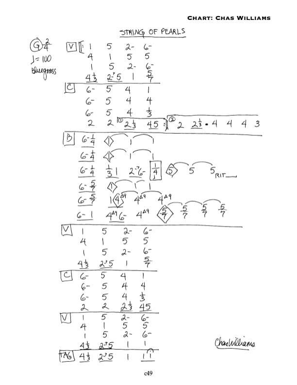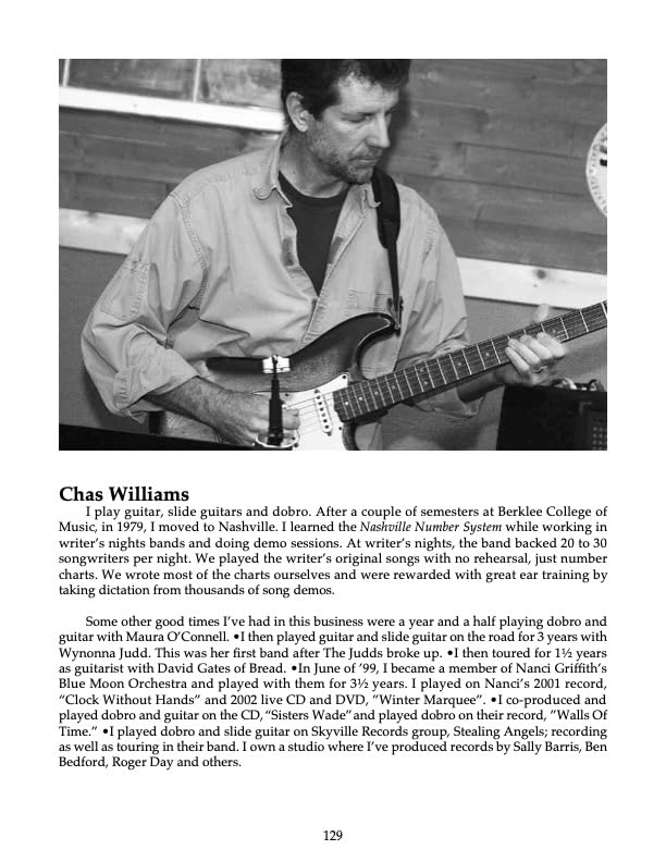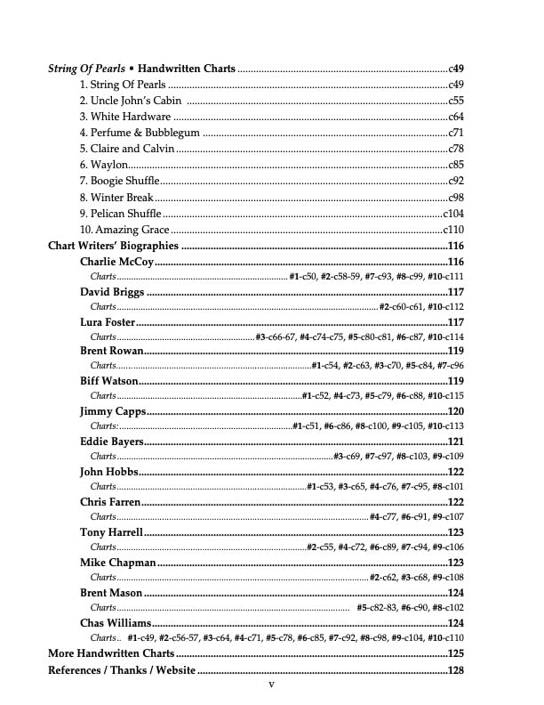 THE NASHVILLE NUMBER SYSTEM In the late 50’s, Neil Matthews devised a musical number system for the Jordanaires to use in the studio. Charlie McCoy and fellow studio musicians began adapting Matthews’ number system into chord charts. The Nashville Number System has evolved into a complete method of writing chord charts and melodies—combining Nashville shorthand with formal notation standards. The Nashville Number System is 129 pages with a step by step method of how to write a Nashville number chart for any song. Included with each NNS book in Edition 11 is the cd download, “String Of Pearls”. This is a 10 song cd of instrumentals, including, Amazing Grace. I walk you through the details of each song and explain the Number System tools used to write the charts. Now, while listening to the music, you can see and hear how Nashville number charts work. THE NASHVILLE NUMBER SYSTEM includes a collection of handwritten number charts for the songs on the album, String Of Pearls. Each song is charted by hand from the cd by: Charlie McCoy (Hee-Haw) David Briggs (Session Keyboardist/Arranger) Eddie Bayers (Session drummer) Jimmy Capps (Studio guitarist, Grand Ole Opry Staff Band) Brent Rowan (Studio guitarist/Producer) Lura Foster (Charts for TV shows: Nashville Now, Music City Tonight, Primetime Country) John Hobbs (Session Keyboardist) Mike Chapman (Session Bassist) Biff Watson (Session Guitarist) Chris Farren (Producer/Guitarist) Tony Harrell (Session Keyboardist/Studio Owner) Each of these musicians wrote 5 number charts in his or her style from the String Of Pearls cd. For example, the song, String Of Pearls, has charts written by: Charlie McCoy, Brent Rowan, John Hobbs, Jimmy Capps and Biff Watson. The song, Waylon, has charts written by Tony Harrell, Lura Foster, Chris Farren, Biff Watson and Eddie Bayers. The idea is that you ll be able to compare, side by side, some of the different styles of notation and symbols you can use to chart the same piece of music. So, as you listen to a song on the cd, you can flip between different charts written of the same song. These different charts represent the kinds of numbering techniques that you are liable to run into in almost all of the major recording and television studios, clubs, showcases, rehearsal halls, and other situations where music is performed in Nashville.