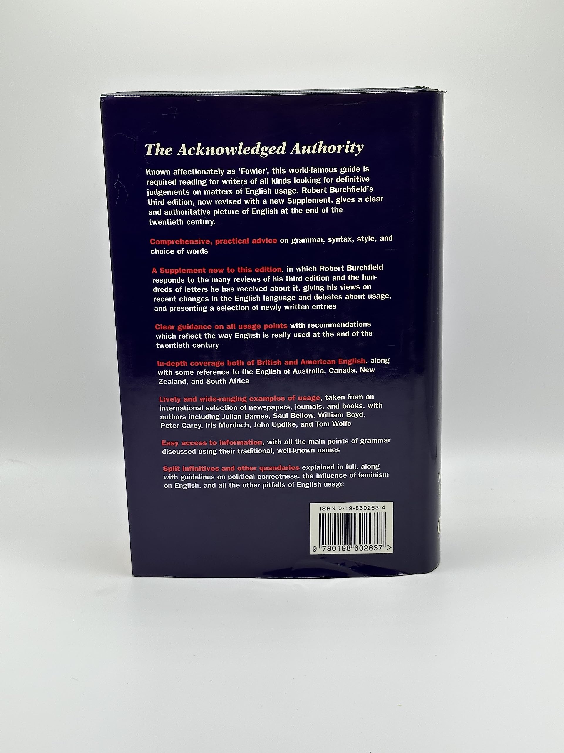 “Fowlers” has sold over a million copies over seven decades. For this new revision, eminent lexicographer Robert Burchfield has rewritten or otherwise enhanced hundreds of entries and has added twenty-four new entries in a special supplement. The volume remains the classic guide to English usage worldwide. Users will find practical help with grammar, syntax, style, and choice of words; clear guidance on usage offered in light of the language of the 1990s, with many new insights into how English is used today; in-depth coverage of both British and American English, together with aspects of the English of Australia; and wide-ranging illustrative examples, including samples from an international selection of newspapers, journals, and periodicals, as well as from well-known authors such as Martin Amis, Anita Brookner, Ruth Rendell, and John Updike. Whether you have a question about split infinitives, unattached participles, political correctness, or so on, you will find a clear and reliable answer here. A charming blend of information and good humor, The New Fowler’s Modern English Usage offers advice and background information on all aspects of English language, from grammar to spelling to literary style. It is a godsend for writers, broadcasters, journalists, and anyone else who wants to write and speak well.