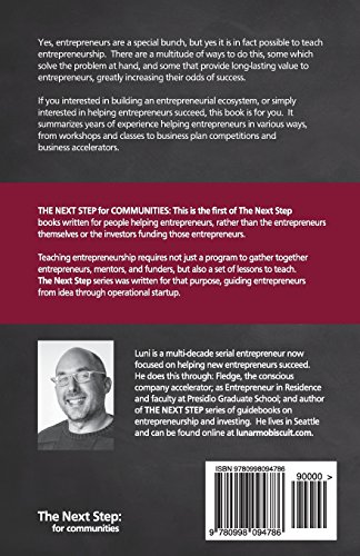 Yes, entrepreneurs are a special bunch, but yes it is in fact possible to teach entrepreneurship. There are a multitude of ways to do this, some which solve the problem at hand, and some that provide long-lasting value to entrepreneurs, greatly increasing their odds of success.If you interested in building an entrepreneurial ecosystem, or simply interested in helping entrepreneurs succeed, this book is for you. It summarizes years of experience helping entrepreneurs in various ways, from workshops and classes to business plan competitions and business accelerators.THE NEXT STEP for COMMUNITIES: This is the first of The Next Step books written for people helping entrepreneurs, rather than the entrepreneurs themselves or the investors funding those entrepreneurs.Teaching entrepreneurship requires not just a program to gather together entrepreneurs, mentors, and funders, but also a set of lessons to teach. The Next Step series was written for that purpose, guiding entrepreneurs from idea through operational startup.
