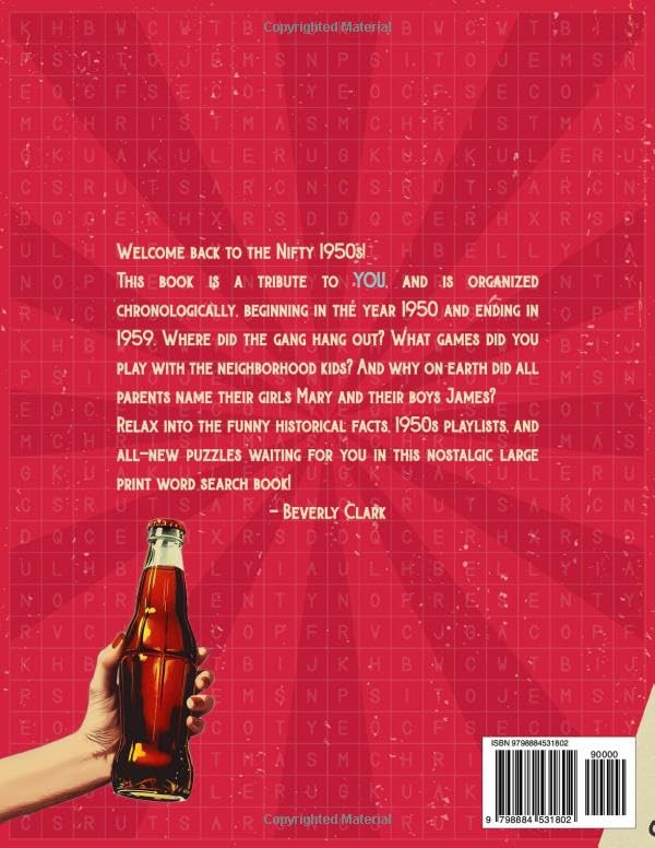 If you love the 1950s, seek to stay sharp, and want a productive pastime… Grab your pen (not your readers) and enjoy these large print puzzles! The Story Behind the Book This book is dedicated to my friend Becky, who grew up in the 1950s. The older we get, the more we find ourselves saying, “Wow, I forgot about that!” So to unlock the most memories, this book goes chronologically through the 1950s, deep-diving into each year. Nostalgia has a special way of lighting up our lives, and I hope you feel its warmth. Love you, Becky! Your Time Machine Awaits!: Get back to coolsville with 101 retro puzzles, quotes, and nostalgic tidbits to spark conversations with your friends and make you all exclaim, “By George, I remember that! Do you?” Keep your brain brilliant with with 1800+ nostalgic words to find – with absolutely no repeats. Enjoy countless hours of screen-free entertainment and a load of hearty laughs along the way. The Gold-Standard of Gift Giving: Bridge the Generation Gap: play the puzzles together for a great screen-free bonding experience. Just the Right Size (Goldilocks would be proud): 8.5 x 11, with super large print to save tired eyes. Classy Matte Cover: Aesthetically delicious. This book looks lovely on your coffee table! Word Nerd Approved: The Beverly Clark Commitment: enjoy endless variety with no duplicate words, ever. Rest your eyes with our super large print – easy as cake to read! Get your friends asking, “when did Betsy get so darn smart?” withan ever-expanding vocabulary. Well? What are you waiting for, dolls and dreamboats? Get groovin’ today! See you inside! – Beverly Clark
