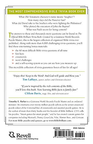The Most Comprehensive Bible Trivia Book Ever Written What Old Testament character’s name means “laughter?” How many days did the Passover last? What did David take to his brothers who were fighting the Philistines? Who plotted the execution of John the Baptist? What was Paul’s secret for being content? The answers to these and thousands more questions can be found in The Official Bible Brilliant Trivia Book. Created by a Guinness World Record Puzzle Master and the senior crossword puzzle editor of USA Today Crosswords, this is the largest collection of organized Bible trivia ever published. Along with more than six thousand challenging trivia questions, it includes these entertaining bonus materials: * A self-scoring system * The 60 most difficult Bible trivia questions of all time * 44 “Did You Know” facts * 5 Bible crosswords * 18 Bible word challenges Designed to teach, challenge, enlighten, and entertain, this compendium of trivia guarantees hours of fun for all ages.