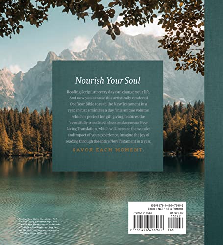 Reading Scripture every day can change your life. You can use the artistically rendered One Year Bible to read the New Testament in a year-in just 5 minutes a day. This unique volume, perfect for gift giving and those looking for a portable New Testament Bible, features the beautifully translated, clear, and accurate New Living Translation, which will increase the wonder and impact of your experience. Key features include: Five-minute daily readings to help you read through the entire New Testament in one year Full-color illustrations on every page, creating a visually rich reading experience Generous, easy-to-read 9.5pt font The clear and trusted New Living Translation (NLT)