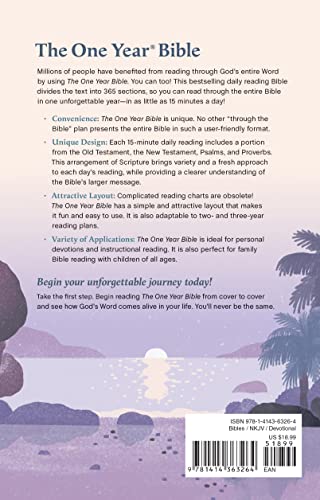 The One Year Bible makes reading through the Bible achievable with daily 15-minute readings from the Old Testament, New Testament, Psalms, and Proverbs. The #1 selling daily reading Bible is now available in stylish TuTone bindings, with inspirational covers featuring the names of God.