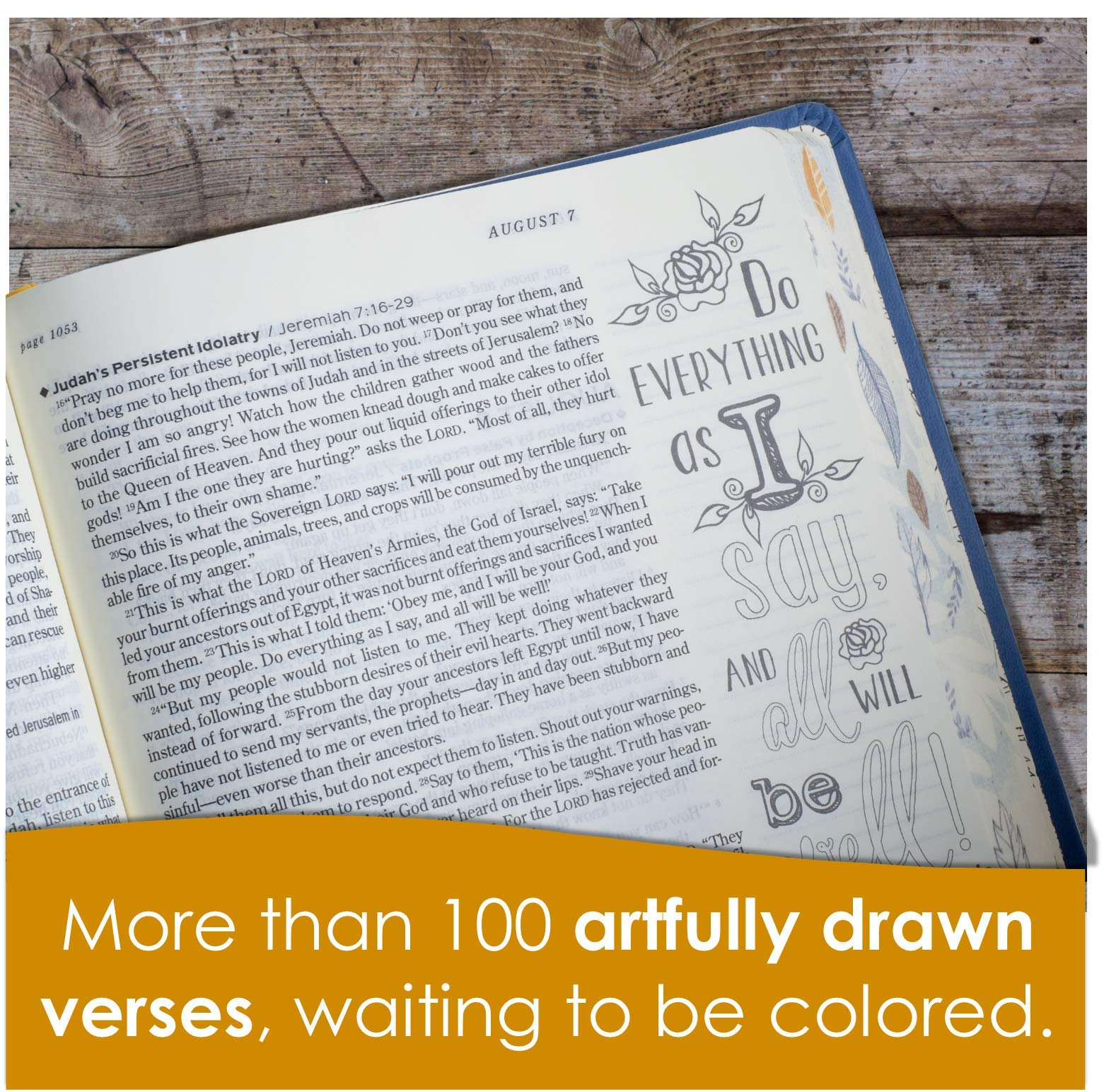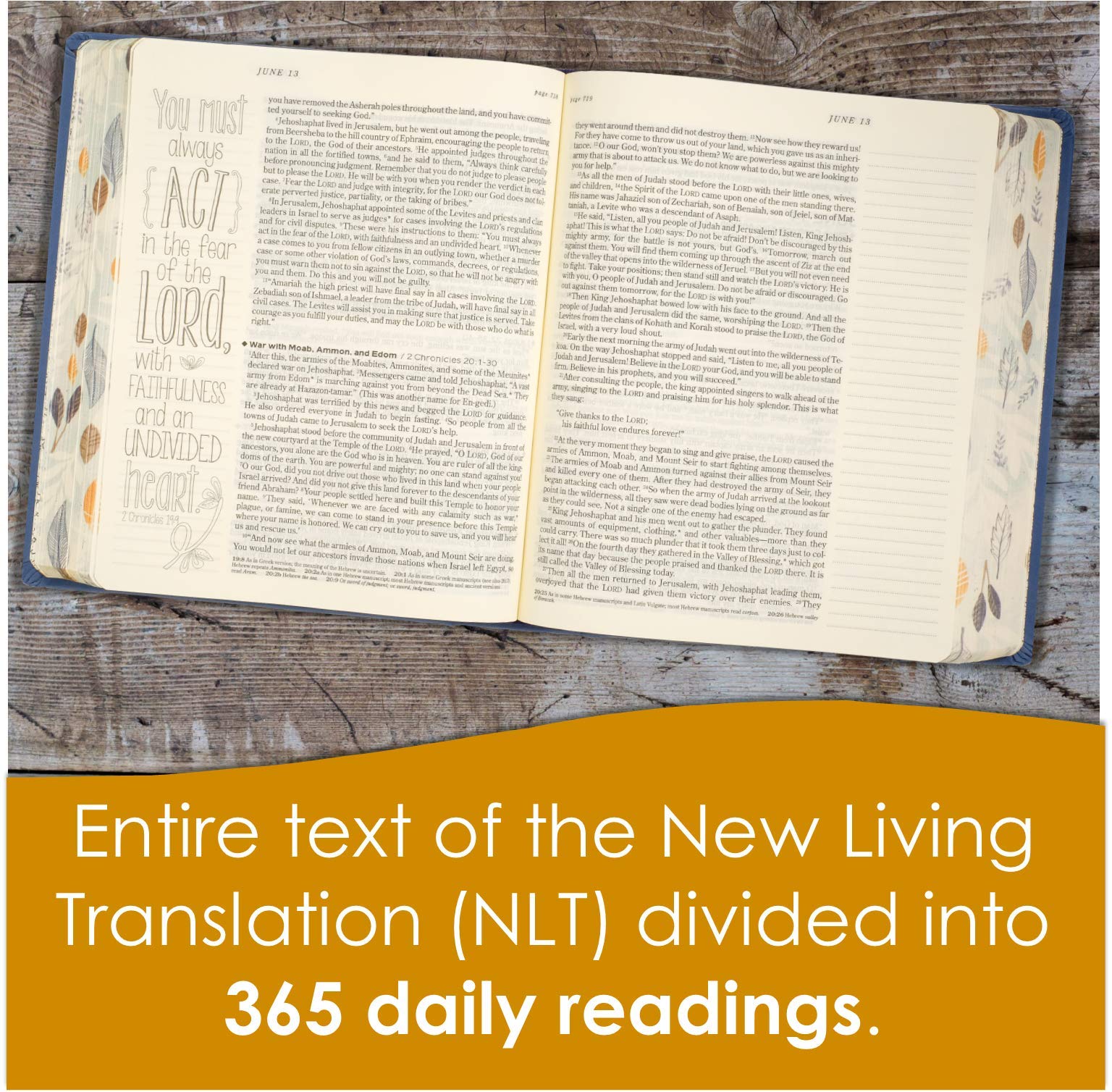 The #1-selling daily reading Bible is more personal than ever with space to read, write, and create! The One Year Chronological Bible Expressions contains the entire text of the New Living Translation divided into 365 daily readings. Each day’s reading focuses on a specific moment in biblical history, taking you through the events of the Bible in the order they occurred. Readers are guided through the entire Bible in a sequential, unforgettable journey that’s easier than ever to make your own. With generous two-inch, lightly-ruled margins and more than 100 artfully drawn verses waiting to be filled in with your most creative ideas, your daily reading experience has never been more personal. Features of this beautiful Bible include: Daily readings in chronological order More than 100 Bible verse line-art images throughout that can be colored in or used as inspiration for Bible memory. Generous two-inch margins provide all the space readers need to write or create every day! The New Living Translation breathes life into even the most difficult-to-understand Bible passages–but even more powerful are the stories of how people’s lives are changing as the words speak directly to their hearts.