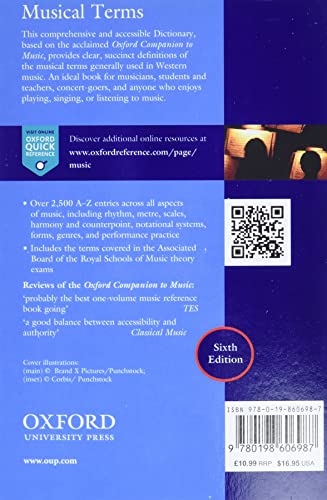 Printed music and writing about music involve the use of complex systems of notation and a wealth of technical terms in several languages. The Oxford Dictionary of Musical Terms provides clear, succinct, definitions of a comprehensive range of the musical terms, in English and other European languages, that are likely to be encountered in Western music, including in jazz and popular musical genres. Over 2,500 A-Z entries range across a spectrum of subjects, among them: rhythm, meter, forms, genres, pitch, scales, chords, harmony and counterpoint, notational systems, composition and analysis, performance practice, tempo, expression, musical periods, artistic movements, computer applications, acoustics, and many more. Entries provide etymologies, and are fully cross-referenced. Some are illustrated with music examples and tables. An appendix lists all composers mentioned in the Dictionary, with their dates. An ideal book for composers, professional musicians, those learning to play musical instruments, and members of choirs and musical groups, the Dictionary is also be a useful quick reference book for concert-goers, CD-collectors, and radio listeners.