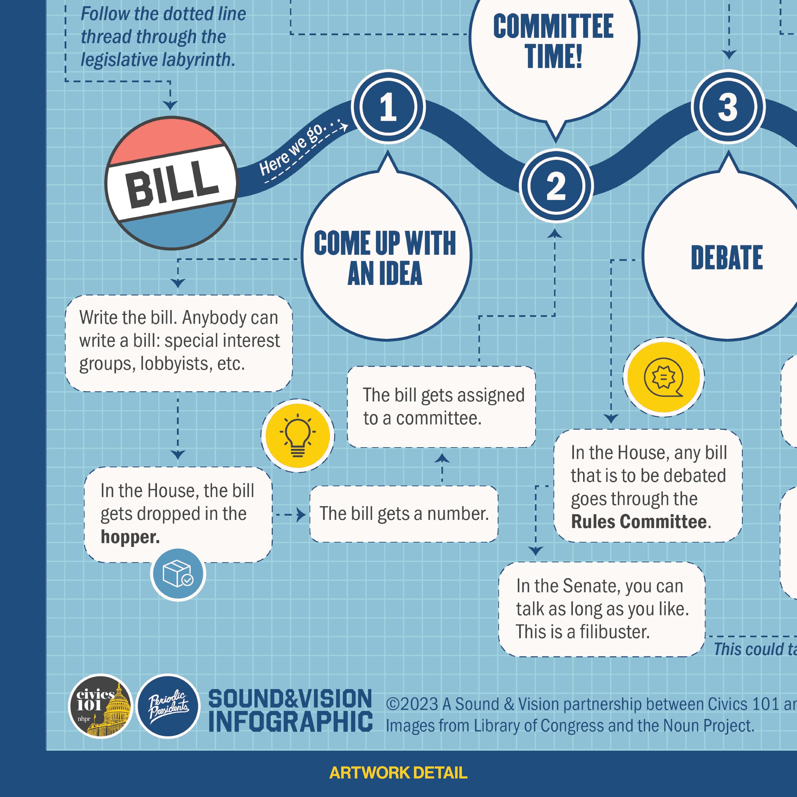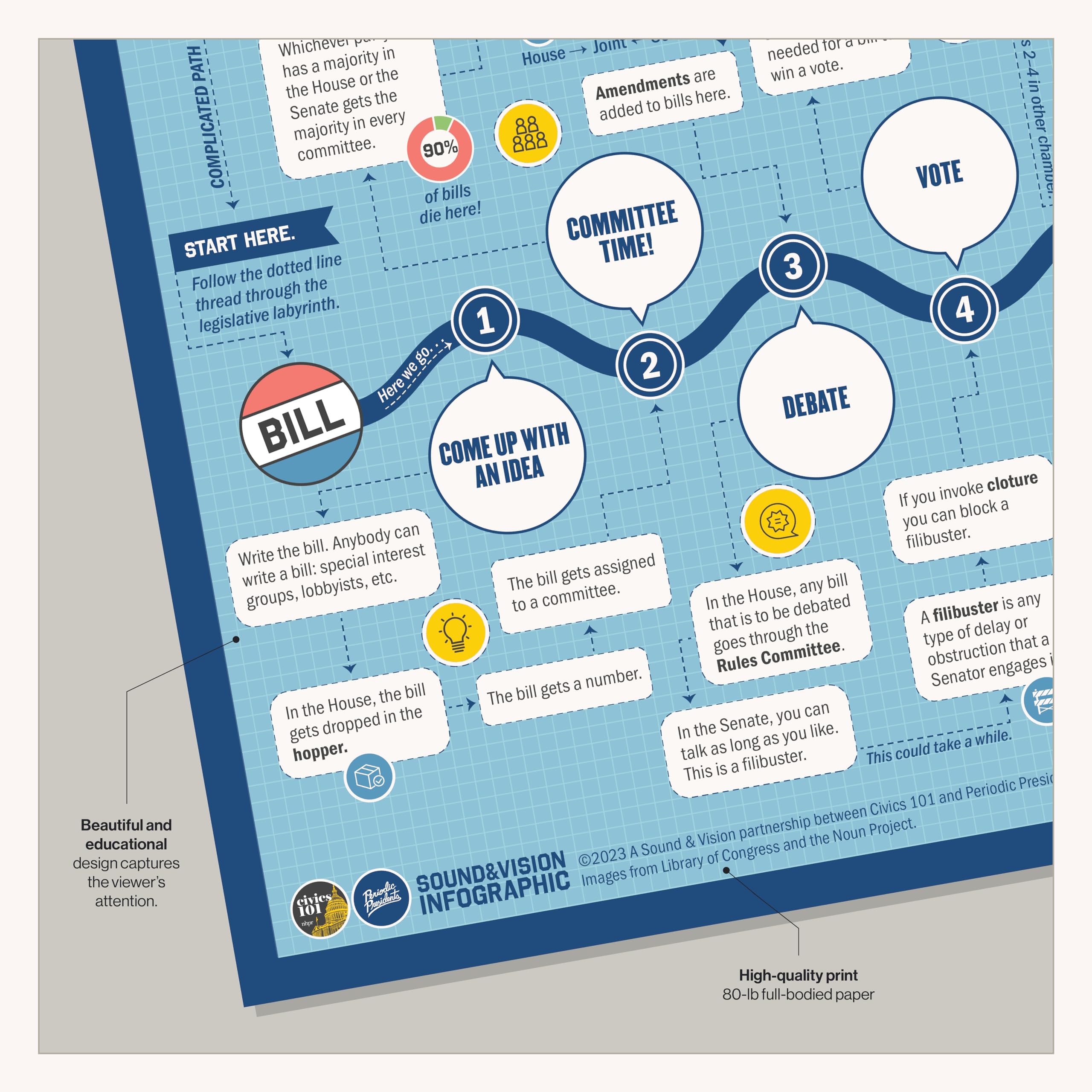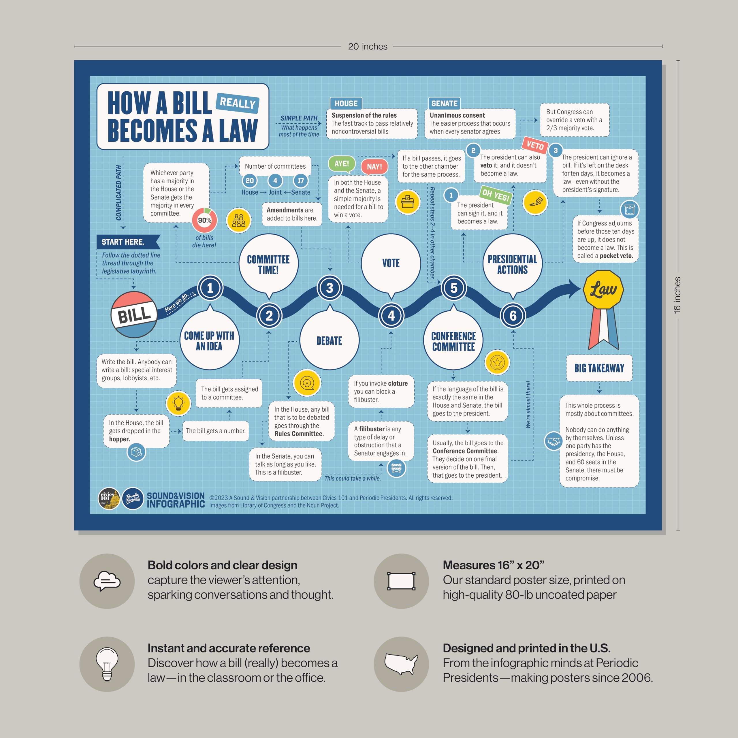 This poster provides a visual aid for learning about U.S. history, civics, and the legislative process.