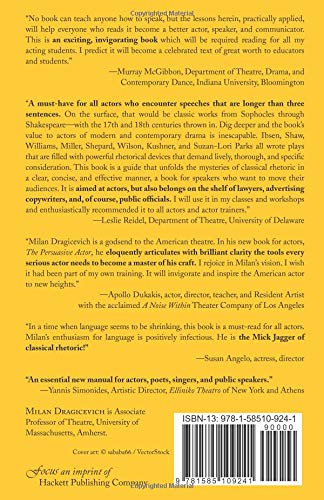 “A must-have for all actors who encounter speeches that are longer than three sentences. On the surface, that would be classic works from Sophocles through Shakespeare–with the 17th and 18th centuries thrown in. Dig deeper and the book’s value to actors of modern and contemporary drama is inescapable. Ibsen, Shaw, Williams, Miller, Shepard, Wilson, Kushner, and Suzan-Lori Parks all wrote plays that are filled with powerful rhetorical devices that demand lively, thorough, and specific consideration. This book is a guide that unfolds the mysteries of classical rhetoric in a clear, concise, and effective manner, a book for speakers who want to move their audiences. It is aimed at actors, but also belongs on the shelf of lawyers, advertising copywriters, and, of course, public officials. I will use it in my classes and workshops and enthusiastically recommended it to all actors and actor trainers.” –Leslie Reidel, Department of Theatre, University of Delaware