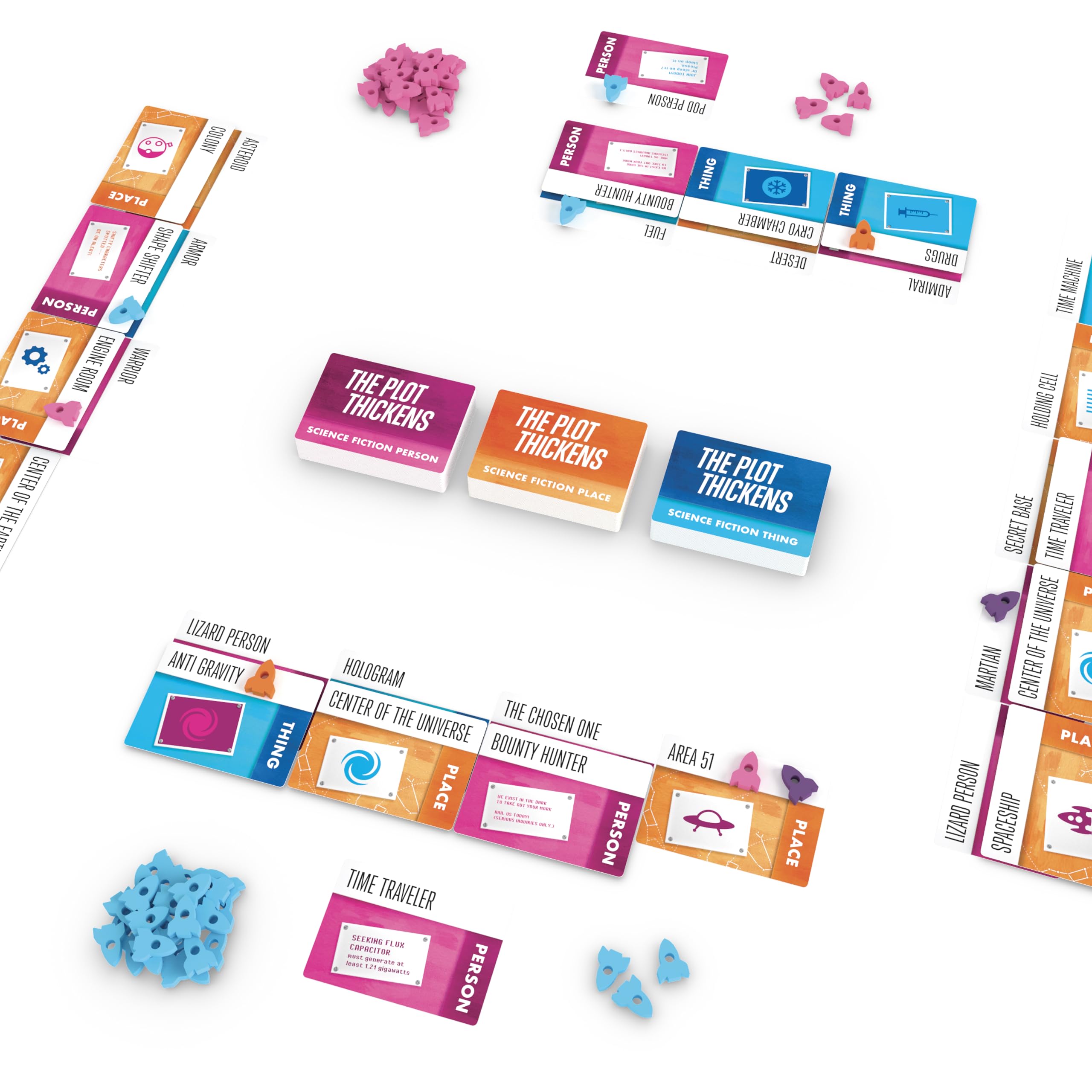 Players tell an improvised story from a hand of 5 word cards each representing a person place or thing. The object of the game is to collaborate and connect stories as much as possible using ‘plot points’ that are earned by playing each card. At the end of the game the player who connected the most decides how the story ends while the player with the most connections to their cards gets to choose a name for the story.