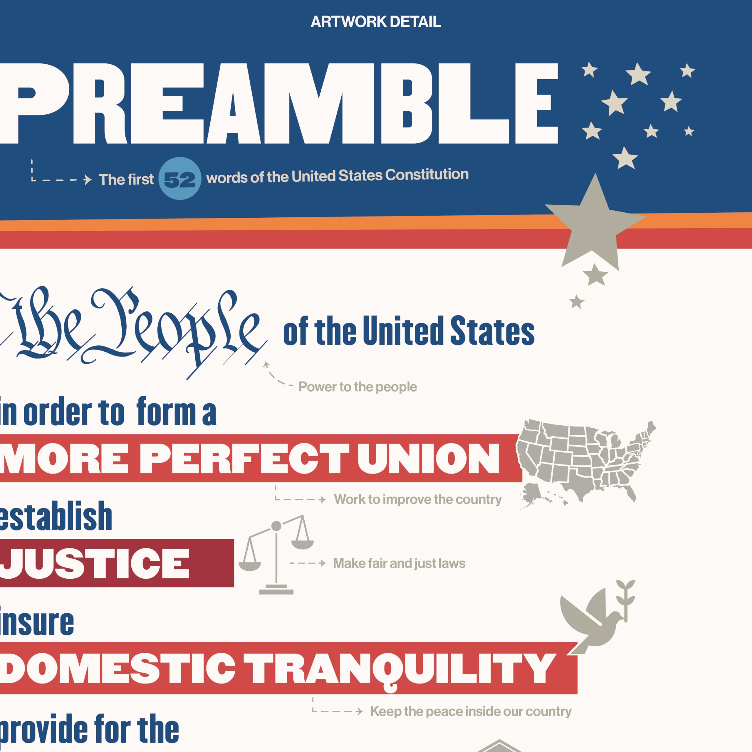 • Bold colors and clear design show the Constitution’s famous first 52 words.