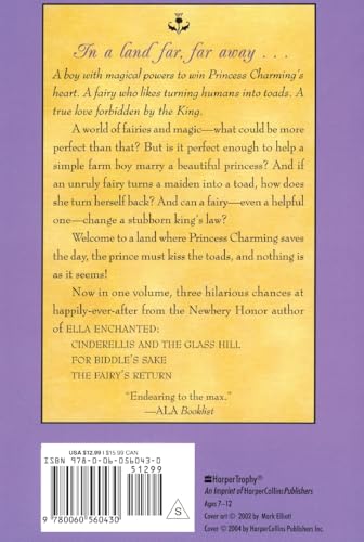In a land far, far away . . . A boy with magical powers to win Princess Charming’s heart. A fairy who likes turning humans into toads. A true love forbidden by the King. A world of fairies and magic — what could be more perfect than that? But is it perfect enough to help a simple farm boy marry a beautiful princess? And if an unruly fairy turns a maiden into a toad, how does she turn herself back? And can a fairy — even a helpful one — change a stubborn king’s law? Welcome to a land where Princess Charming saves the day, the prince must kiss the toads, and nothing is as it seems! Now in one volume, three hilarious chances at happily-ever-after from the Newbery Honor author of Ella Enchanted: Cinderellis and the Glass Hill For Biddle’s Sake The Fairy’s Return