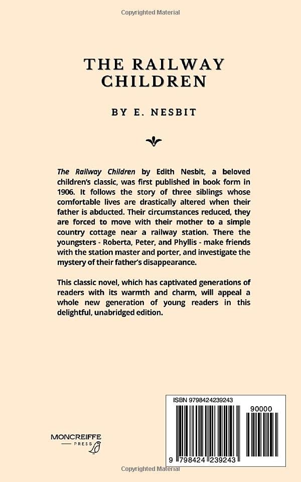 Unique Elements Historical context Detailed 20th century analysis The Unmissable Children’s Literature Classic by E. Nesbit The Railway Children by English author E. Nesbit is a book of children’s fiction first published in 1906 in the UK. This celebrated classic of children’s literature which has captivated generations of readers with its warmth and charm, will appeal a whole new generation of young readers. Excerpt ‘There was a pleasant party of barge people round the fire. You might not have thought it pleasant, but they did; for they were all friends or acquaintances, and they liked the same sort of things, and talked the same sort of talk. This is the real secret of pleasant society.’ Synopsis The novel follows the story of three siblings whose comfortable lives are drastically altered when their father is abducted. Their circumstances reduced, they are forced to move with their mother to a simple country cottage near a railway station. There the youngsters – Roberta, Peter, and Phyllis – make friends with the station master and porter, and investigate the mystery of their father’s disappearance. Title Details * Original 1906 text * Children’s Classic Fiction * 5 x 8 in * Matte Cover * Cream Paper