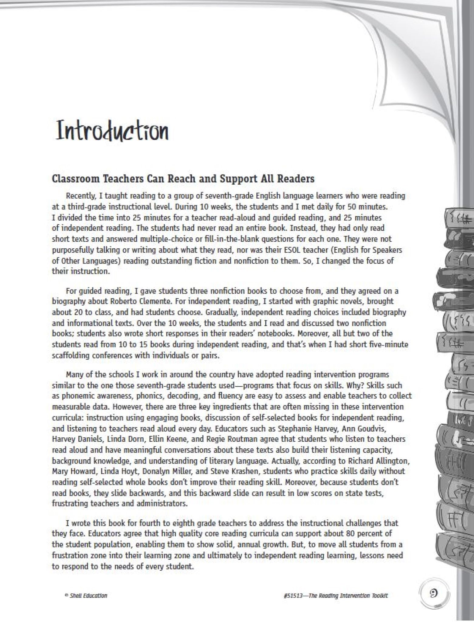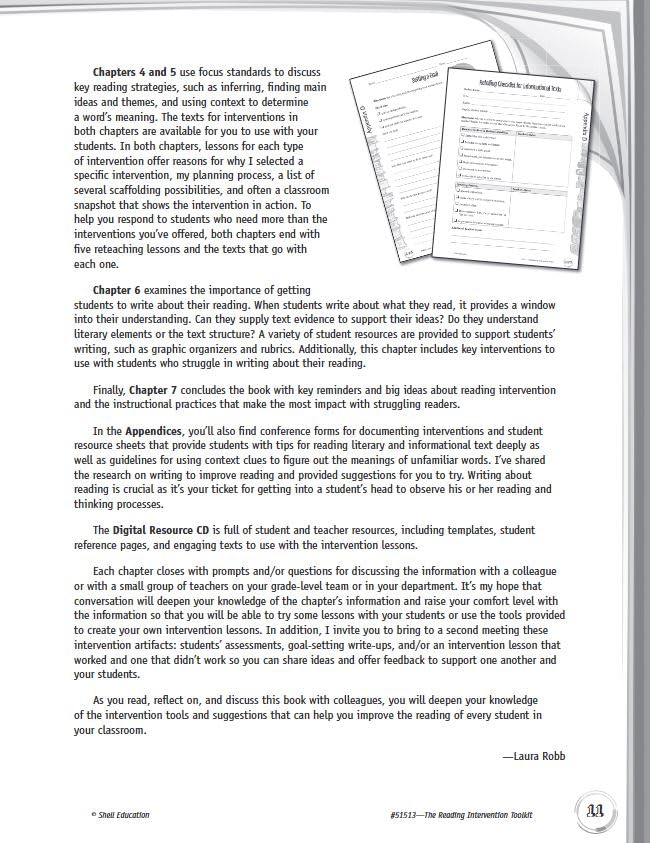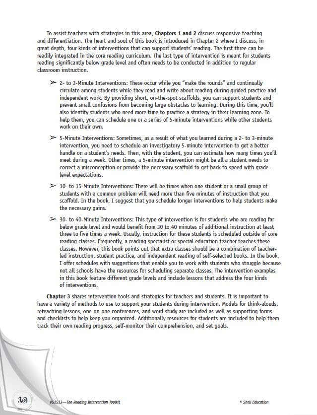 This classroom resource addresses the instructional challenges faced by fourth to eighth grade teachers and provides research-based tools needed to improve students’ reading comprehension. These classroom-tested interventions can be used with struggling readers in 5-, 10 to 15-, and 30 to 40-minute settings. Key features of this professional development resource include: responsive teaching and differentiation; the four kinds of interventions that can support students’ reading; intervention tools and strategies for teachers and students; the use of focus standards to discuss key reading strategies (inferring, finding main ideas and themes, and using context to determine a word’s meaning); and getting students to write about their reading.