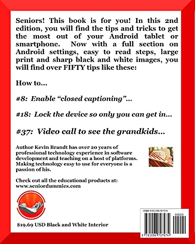 Seniors! This book is for you! Thousands of copies sold! In this 2nd edition, you will find the tips and tricks to get the most out of your Android tablet or smartphone. Now with a full section on Android settings, easy to read steps, large print and sharp black and white images, you will find over FIFTY tips like these: How to… #8: Enable “closed captioning”… #18: Lock the device so only you can get in… #37: Video call to see the grandkids… This version of the popular book contains large print and sharp black and white images for a more economical price than our full color version!