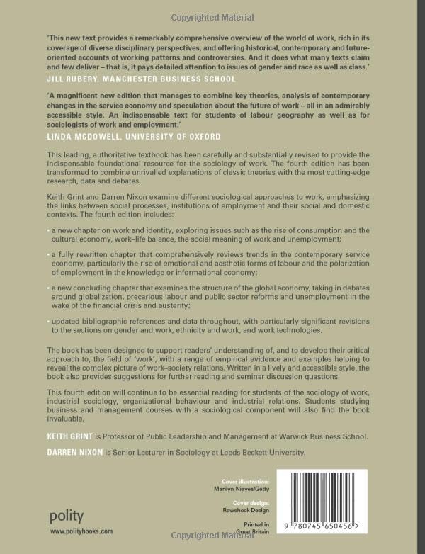 This leading, authoritative textbook has been carefully and substantially revised to provide the indispensable foundational resource for the sociology of work. The fourth edition has been transformed to combine unrivalled explanations of classic theories with the most cutting-edge research, data and debates. Keith Grint and Darren Nixon examine different sociological approaches to work, emphasizing the links between social processes, institutions of employment and their social and domestic contexts. The fourth edition includes: a new chapter on work and identity, exploring issues such as the rise of consumption and the cultural economy, work-life balance, the social meaning of work and unemployment; a fully rewritten chapter that comprehensively reviews trends in the contemporary service economy, particularly the rise of emotional and aesthetic forms of labour and the polarization of employment in the knowledge or informational economy; a new concluding chapter that examines the structure of the global economy, taking in debates around globalization, precarious labour and public sector reforms and unemployment in the wake of the financial crisis and austerity; updated bibliographic references and data throughout, with particularly significant revisions to the sections on gender and work, ethnicity and work, and work technologies. The book has been designed to support readers’ understanding of, and to develop their critical approach to, the field of ‘work’, with a range of empirical evidence and examples helping to reveal the complex picture of work-society relations. Written in a lively and accessible style, the book also provides suggestions for further reading and seminar discussion questions. This fourth edition will continue to be essential reading for students of the sociology of work, industrial sociology, organizational behaviour and industrial relations. Students studying business and management courses with a sociological component will also find the book invaluable.