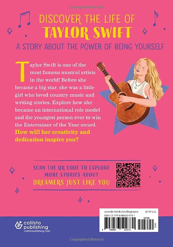 Discover the life of Taylor Swift–a story about the power of words and being yourself for kids ages 6 to 9 Taylor Swift is one of the most famous musical artists in the world! Before she became a big star, she was a little girl who loved country music and writing stories. Explore how she went from growing up on a Christmas tree farm in Pennsylvania to being an international role model and the youngest person ever to win the Entertainer of the Year award. Independent reading–This Taylor Swift biography for kids is broken down into short chapters and simple language so young readers 6 to 9 can learn on their own. Critical thinking–Kids will learn the Who, What, Where, When, Why, and How of Taylor’s life, and find definitions of new words, discussion questions, and more. A lasting legacy–Find out how Taylor’s kindness, ambition, and talent for storytelling have made her an incredible figure in music and pop culture. How will Taylor’s creativity and dedication inspire you? Discover activists, artists, athletes, and more from across history with the rest of The Story Of series, including famous figures like: Simone Biles, Jane Goodall, Ella Fitzgerald, Audrey Hepburn, and Frida Kahlo.