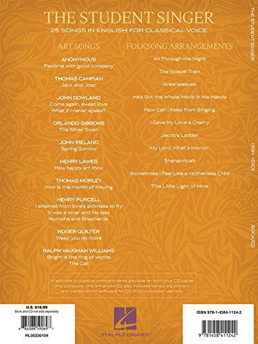 (Vocal Collection). This collection for progressing students includes art songs, as well as arrangements of folksongs and spirituals. ART SONGS Anonymous : Pastime with good company * Campian : Jack and Joan * Dowland : Come again, sweet love * Dowland : What if I never speed * Gibbons : The Silver Swan * Ireland : Spring Sorrow * Lawes : How happy art thou * Morley : It was a lover and his lass * Morley : Now is the month of Maying * Purcell : I attempt from love’s sickness * Purcell : Nymphs and Shepherds * Quilter : Weep you no more * Vaughan Williams : The Call * Vaughan Williams : Bright is the ring of words * FOLKSONGS/SPIRITUALS All Through the Night (arr. Nicholl) * The Gospel Train (Walters) * Greensleeves (arr. Stanley) * He’s Got the Whole World in His Hands (arr. Boyd) * How Can I Keep from Singing (arr. Ruck) * I gave my love a cherry (arr. Dean) * Jacob’s Ladder (arr. Walters) * My Lord, What a Mornin’ (arr. Burleigh) * Shenandoah (arr. Walters) * Sometimes I Feel Like a Motherless Child (arr. Walters) * This Little Light of Mine (arr. Ruck). Audio is accessed online using the unique code inside the book and can be streamed or downloaded. The audio files include PLAYBACK+, a multi-functional audio player that allows you to slow down audio without changing pitch, set loop points, change keys, and pan left or right.