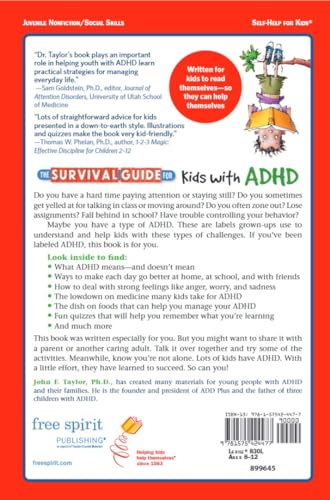 What are ADHD? What does it mean to have ADHD? How can kids diagnosed with ADHD help themselves succeed in school, get along better at home, and form healthy, enjoyable relationships with peers? In kid-friendly language and a format that welcomes reluctant and easily distracted readers, this book helps kids know they’re not alone and offers practical strategies for taking care of oneself, modifying behavior, enjoying school, having fun, and dealing with doctors, counselors, and medication. Includes real-life scenarios, quizzes, and a special message for parents. Survival Guides for Kids Helping Kids Help Themselves(r) Straightforward, friendly, and loaded with practical advice, the Free Spirit Survival Guides for Kids give kids the tools they need to not only survive, but thrive. With plenty of realistic examples and bright illustrations, they are accessible, encouraging, kid-friendly, and even life-changing.