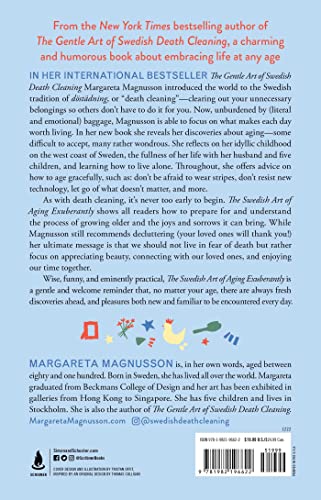 From the New York Times bestselling author of The Gentle Art of Swedish Death Cleaning, a book of humorous and charming advice for embracing life and aging joyfully. In her international bestseller The Gentle Art of Swedish Death Cleaning Margareta Magnusson introduced the world to the Swedish tradition of dostadning, or “death cleaning”–clearing out your unnecessary belongings so others don’t have to do it for you. Now, unburdened by (literal and emotional) baggage, Magnusson is able to focus on what makes each day worth living. In her new book she reveals her discoveries about aging–some difficult to accept, many rather wondrous. She reflects on her idyllic childhood on the west coast of Sweden, the fullness of her life with her husband and five children, and learning how to live alone. Throughout, she offers advice on how to age gracefully, such as: wear stripes, don’t resist new technology, let go of what doesn’t matter, and more. As with death cleaning, it’s never too early to begin. The Swedish Art of Aging Exuberantly shows all readers how to prepare for and understand the process of growing older and the joys and sorrows it can bring. While Magnusson still recommends decluttering (your loved ones will thank you!), her ultimate message is that we should not live in fear of death but rather focus on appreciating beauty, connecting with our loved ones, and enjoying our time together. Wise, funny, and eminently practical, The Swedish Art of Aging Exuberantly is a gentle and welcome reminder that, no matter your age, there are always fresh discoveries ahead, and pleasures both new and familiar to be encountered every day.