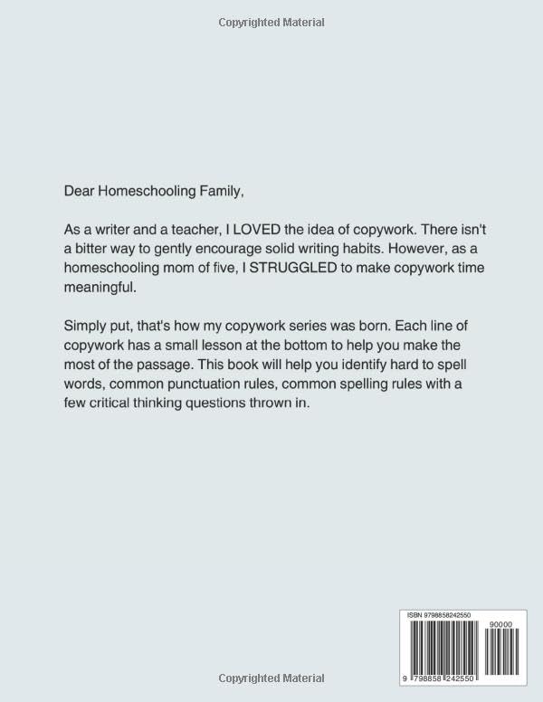 Charlotte Mason’s copywork as a way to improve writing has endured the test of time because it works! From the beloved Tale of Peter Rabbit, each page features a short and manageable piece of the story, combined with lined handwriting space. It makes perfect penmanship practice for 2nd through 4th grade. Practice Handwriting and Learn Grammar, Writing, Critical Thinking and More Copywork is a great way to improve grammar, spelling, and writing skills. This copywork book includes over 82 pages of copywork assignments. Each assignment has a short discussion question designed to help you make the most out of copywork with your student. Each page features a printed quote & lines for copying. Suitable for 2nd-4th grade