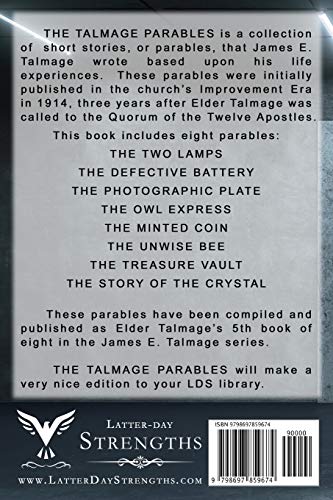 THE TALMAGE PARABLES is a collection of eight short stories, or parables, that James E. Talmage wrote based upon his life experiences. These parables were initially published in the church’s Improvement Era in 1914, three years after Elder Talmage was called to the Quorum of the Twelve Apostles.These parables have been compiled and published as Elder Talmage’s 5th book of eight in the James E. Talmage series. This publication includes the following parables:THE TWO LAMPSTHE DEFECTIVE BATTERYTHE PHOTOGRAPHIC PLATETHE OWL EXPRESSTHE MINTED COINTHE UNWISE BEETHE TREASURE VAULTTHE STORY OF THE CRYSTALTHE TALMAGE PARABLES will make a very nice edition to your LDS library.
