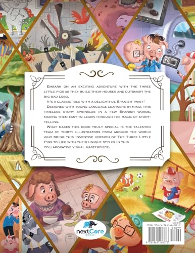 Embark on an exciting adventure with the three little pigs as they build their houses and outsmart the big bad lobo. It’s a classic tale with a delightful Spanish twist! Designed with young language learners in mind, this timeless story sprinkles in a few Spanish words, making them easy to learn through the magic of storytelling. What makes this book truly special is the talented team of thirty illustrators from around the world who bring this inventive version of The Three Little Pigs to life with their unique styles in this collaborative visual masterpiece.