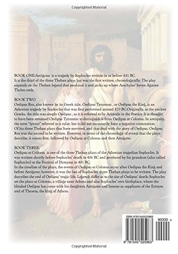BOOK ONE:Antigone is a tragedy by Sophocles written in or before 441 BC. It is the third of the three Theban plays but was the first written, chronologically. The play expands on the Theban legend that predated it and picks up where Aeschylus’ Seven Against Thebes ends. BOOK TWO Oedipus Rex, also known by its Greek title, Oedipus Tyrannus , or Oedipus the King, is an Athenian tragedy by Sophocles that was first performed around 429 BC.Originally, to the ancient Greeks, the title was simply Oedipus , as it is referred to by Aristotle in the Poetics. It is thought to have been renamed Oedipus Tyrannus to distinguish it from Oedipus at Colonus. In antiquity, the term “tyrant” referred to a ruler, but it did not necessarily have a negative connotation. Of his three Theban plays that have survived, and that deal with the story of Oedipus, Oedipus Rex was the second to be written. However, in terms of the chronology of events that the plays describe, it comes first, followed by Oedipus at Colonus and then Antigone. BOOK THREE: Oedipus at Colonus is one of the three Theban plays of the Athenian tragedian Sophocles. It was written shortly before Sophocles’ death in 406 BC and produced by his grandson (also called Sophocles) at the Festival of Dionysus in 401 BC. In the timeline of the plays, the events of Oedipus at Colonus occur after Oedipus the King and before Antigone; however, it was the last of Sophocles’ three Theban plays to be written. The play describes the end of Oedipus’ tragic life. Legends differ as to the site of Oedipus’ death; Sophocles set the place at Colonus, a village near Athens and also Sophocles’ own birthplace, where the blinded Oedipus has come with his daughters Antigone and Ismene as suppliants of the Erinyes and of Theseus, the king of Athens.