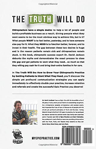 Chiropractors have a simple desire: to help a lot of people and build a profitable business as a result. Giving people what they want seems to be the most obvious way to achieve this, but is it? What people WANT is to feel better, yesterday, and to have someone else pay for it. What they NEED is to function better, forever, and to invest in their health. The gap between these two desires is huge and is the reason patients remain sick and chiropractors remain stuck. In this book, chiropractic success expert Dr. David Jackson debunks the myths and demonstrates the exact process to close this gap and get patients to want what they need… so much so they happily pay cash for it and bring their entire families in for care.In The Truth Will Do: How to Grow Your Chiropractic Practice by Getting Patients to Want What They Need, you’ll discover the simple yet profound communication strategies you can apply immediately to effectively double your practice, increase retention and referrals and create the successful Epic Practice you deserve!