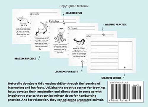 Naturally develop a kid’s reading ability through the learning of interesting and fun facts. Utilizing the creative corner for drawings, helps develop their imagination and allows them to come up with imaginative stories that can be written down for handwriting practice. And for relaxation, they can color the presented animals. This workbook features: over 60 animal illustrations for coloring fun facts about each presented animal 122 handwriting practice pages over 60 creative corners for drawings, mind maps, ideas, and more… Size: 8.25 x 6 inches Paperback. Matte, soft cover design White interior pages Please see the back cover for a preview of the interior. See author “Sveta Pismo” for more fun kid products.