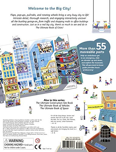 “Playful, detail-rich scenes give readers plenty to pore over.” — Publishers Weekly Learn all about the people, places, and vehicles that make the city go: The express bus drives passengers to work, swans swim in the lake at the park… Best of all, lots of flaps, popups, pull-tabs, and rotating wheels bring a vibrant city to life. Readers will learn what traffic signs mean, see all that goes on in big buildings, and visit a fire station. Any child who is interested in how cities work adore this extraordinary book. * Supersized spreads feature marvelously detailed illustrations that just beg to be pored over again and again * More than 55 interactive flaps, tabs, and more to keep kids engaged * A captivating adventure that brings the city and the magic of books to life in young minds “There’s lots to see and do in this big city.” — Kirkus Reviews Fans of How Things Work will also enjoy the stunning details and interactive fun of The Ultimate Book of Cities. * Great family read-aloud book * Books for kids ages 5-8 * Books for preschool, kindergarten, and elementary school children
